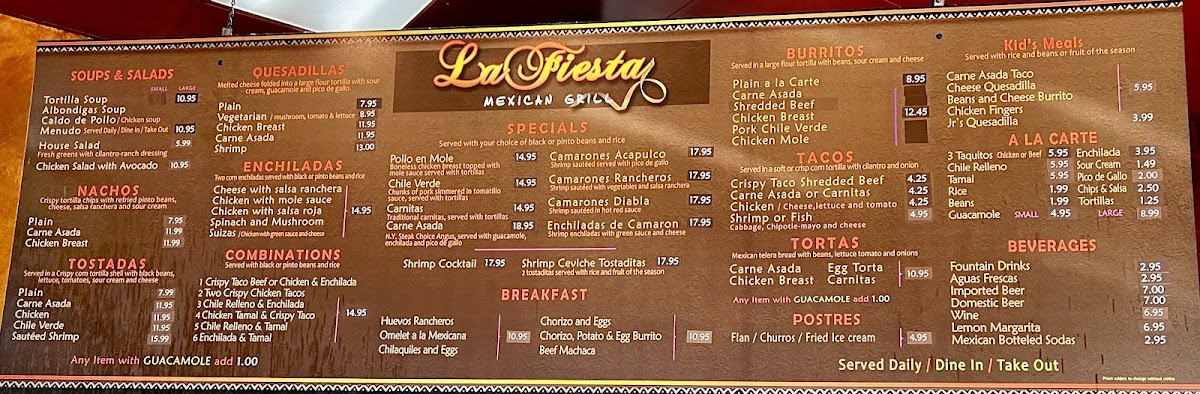 La Fiesta's menu is a celebration of classic Mexican dishes, featuring succulent options that will leave your taste buds dancing. Start your meal with their mouthwatering Quesadillas—try the Chicken Breast or the Shrimp for an elevated taste experience. For heartier appetites, their Burritos can’t be beaten; the Chili Verde is particularly noteworthy, described by loyal patrons as “insane in flavor.” And don’t miss out on their famous Taco Tuesday, where crispy chicken, beef, and even potato tacos showcase the creativity and freshness La Fiesta is known for.